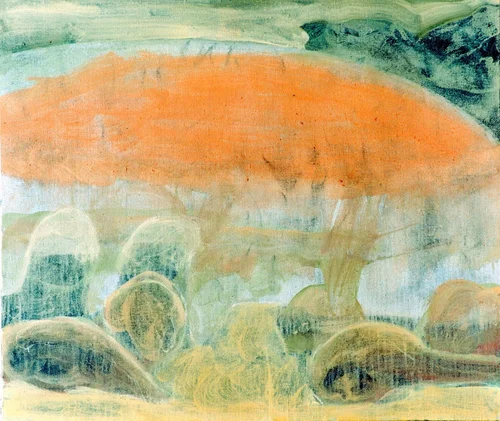 Taulujen maalaamiseen liittyy hieman dramatiikkaa. Taulu METSÄMANSIKAT JA VUORI putosi seinältä minun päähäni. Tuli aika paljon verta, joten soitin ambulanssin, mutta kesti tunnin ennen kuin se saapui paikalle. Nyt olin ainakin tehnyt taidetta joka koskettaa…